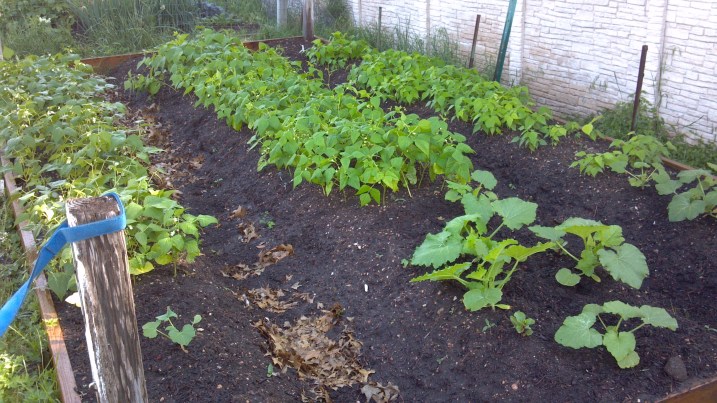 I do plan to do similarly with the Right Bed now that I see our idea in real life (and love it!) But first, we need to trellis-up those tomatoes! (Another day.) And drop lines for the beans (maybe tomorrow…)