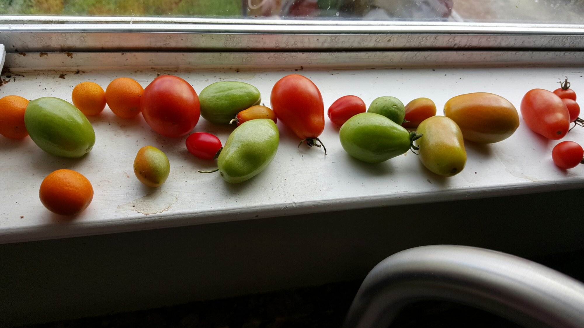 I was mistaken about the last of the tomatoes. I picked a few more yesterday, although they were not immediately gobbled up. So in an odd turn of events (like sowing next year’s exactly when I’d planned to) and weather (the lightest of freezes only days ago) the tomatoes of 2015 have gone full circle and this house shan’t be without a tomato plant even in the depths of winter…provided the seeds sprout.