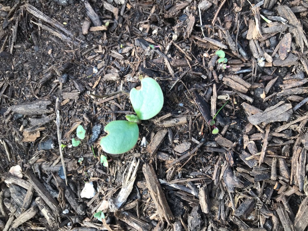 This variety has sprouted in a few spots we sprinkled. Each pair of leaves with a match pair of nibbles. Such consistency that I first thought it a pattern of growth… but it’s instead a habitual snacker.